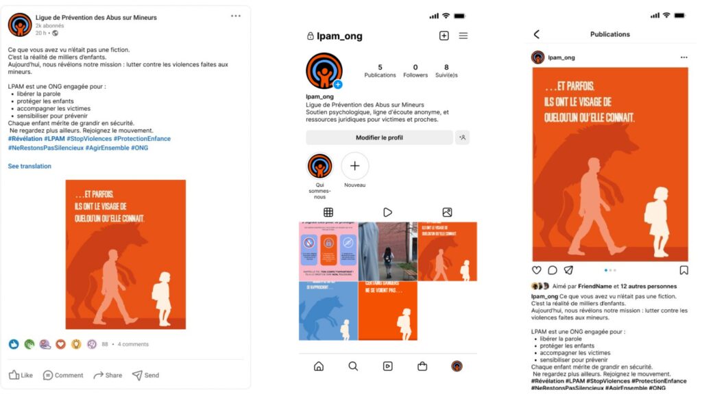 Avec Tharshica, j’ai participé à définir la stratégie de communication de la LPAM, en structurant les axes principaux : prévention, accompagnement, sensibilisation et communication institutionnelle. Nous avons mis en avant les valeurs de l’ONG ; empathie, protection, confidentialité et exactitude, et construit une ligne éditoriale adaptée aux mineurs, à leurs familles et aux professionnels. Les messages clés rappellent le soutien immédiat et sécurisé, la non-responsabilité des mineurs et le rôle actif des proches.